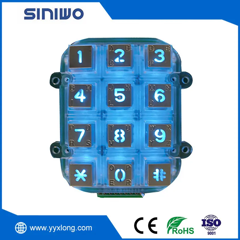 The SINIWO industrial illuminated keypad with high quality used Zinc alloy material, electroplated surface, anti-oxidation and anti-corrosion, durable and wear-resistant and never tarnished.It is mainly for access control system, industrial telephone, vending machine, security system and some other public facilities.